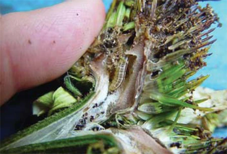 Sunflower moth (Homoeosoma electellum) is one of the most damaging pests of sunflowers and echinacea. Univ. of Md. Extension officials report the larvae have been identified on echinacea. Female adults lay their eggs at the base of the florets. Early instars feed on pollen and florets. Later instars tunnel into the flower consuming tissue and seed. Larval feeding injury provides sites for fungal disease Rhizopus head rot which can lead to complete yield loss. Growers should look for tangled mats of webbing on the flowers which are a sign of larval feeding.
