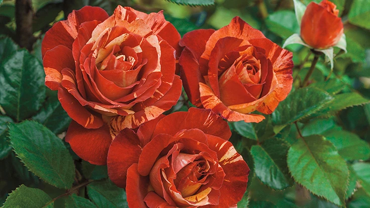 If you’re looking for a new climbing rose to plant this year, Tropical Lightning is it. The tropical warmth of this exciting, exotic colored new rose is generated by a unique flower that’s a combination of sunset orange and a purple smoke layer accented with cream colored stripes. The colors mix together differently on every flower, creating a pleasing striped effect that’s stunning. The canes of this climber reach 10 to 12 feet tall, so Tropical Lightning is both big and dramatic. Each perfectly shaped flower holds its crazy color for days, and the prolific plant only slows down the flowering as it cools down for winter.