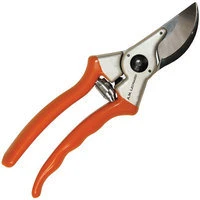 Designed for all-around use, the chrome-plated blades resist rust, corrosion, and sap for easy cleaning and keep a keen edge. Anvil blade is riveted to the forged aluminum handles for extra strength. Has a pivot-locking mechanism, and solid forged handles with anti-slip grips. Vinyl coated handles. 8.5-inch overall length; weight of 10 oz. Lifetime warranty.