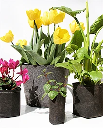 Root Pouch containers from Averna and Associates are made from polyethylene terephthalate (PETE), which comes from recycled plastic beverage bottles. The manufacturing process turns the plastic into non-woven fabric which is used to make a full line of nursery containers including propagation liners and various sizes of plantable pouches. The containers are available in different densities and degradable life spans. Plants grown in Root Pouch containers produce more fibrous roots that do not circle the pots. The Root Pouch needs 60 percent less space for storage or shipping. The fabric containers have no sharp edges so there is less chance for damage in transit and no cracked pots.