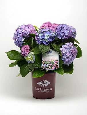 L.A. Dreamin’ is the first H. macrophylla to bloom in blue, pink and everything in between – at the same time, on the same plant, without any aluminum sulfate. This reblooming variety puts on a multi-color show in landscapes and containers all Summer, every Summer, with no special soil treatment to maintain its unique bloom color. With its mandatory branded pot and tag, it’s a real standout in the crowded Hydrangea market!