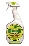 Deer Out Deer Repellent is an all-natural, pleasant-smelling, super-long-lasting product that is guaranteed to stop deer from eating flowers, shrubs, vegetable plants, row crops,trees and vines. Deer Out can last up to three months or more, and it won't wash off. Deer Out has a pleasant peppermint fresh scent.