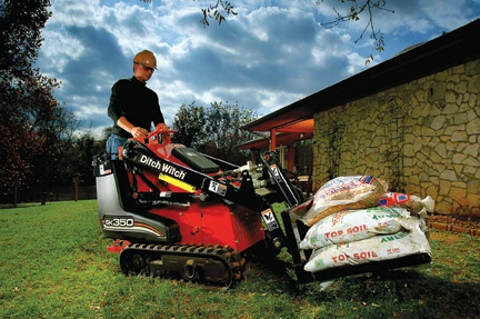 The SK350 mini skid steer from Ditch Witch features a 20-hp Kohler engine and an 11 gpm dual hydrostatic ground drive that gives the same capabilities of larger machines. It has a stand-on platform, a 7.5 gallon fuel tank, wide lift and dump ranges and drives more than 70 compact utility attachments.