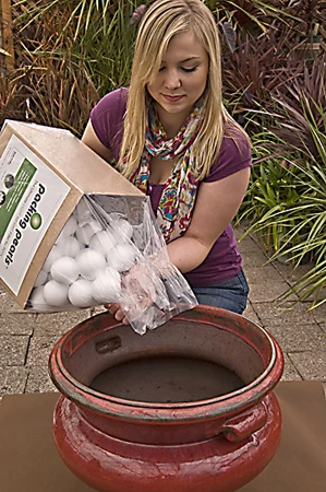 Four Seasons Container Gardens offers Packing Pearls, extra-large polystyrene balls that can be placed at the bottom of large containers to reduce the amount of soil needed. Unlike ordinary packing peanuts which can become compressed over time, Packing Pearls retain their shape even after years of use and re-use. They are made in the U.S. from non-toxic, medical-grade polystyrene and safe to use on all plants including fruits and vegetables.
