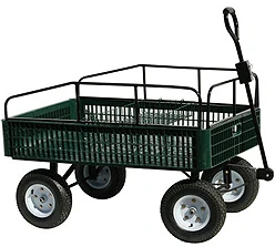The EZ-Haul Garden Crate Wagon from GrowersSupply/FarmTek is ideal for use in the nursery, on the farm, in the yard, or in the garden center. It features auto-type steering and 5-inch x 13-inch pneumatic wheels that make it easy to pull and maneuver. It has a heavy-duty, durable solid poly bed, with removable front and side rails for your oversized loads and a removable basket for smaller items.
