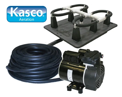 Robust-Aire diffused aeration systems by Kasco Marine are available. Injecting air into the bottom of deeper ponds is the most effective way to circulate and aerate. Complete systems with quality components: 1 to 6 diffusers, post mount or base mount cabinet options, quiet operation, easy installation. No electricity in the water, no disruption of the pond setting.