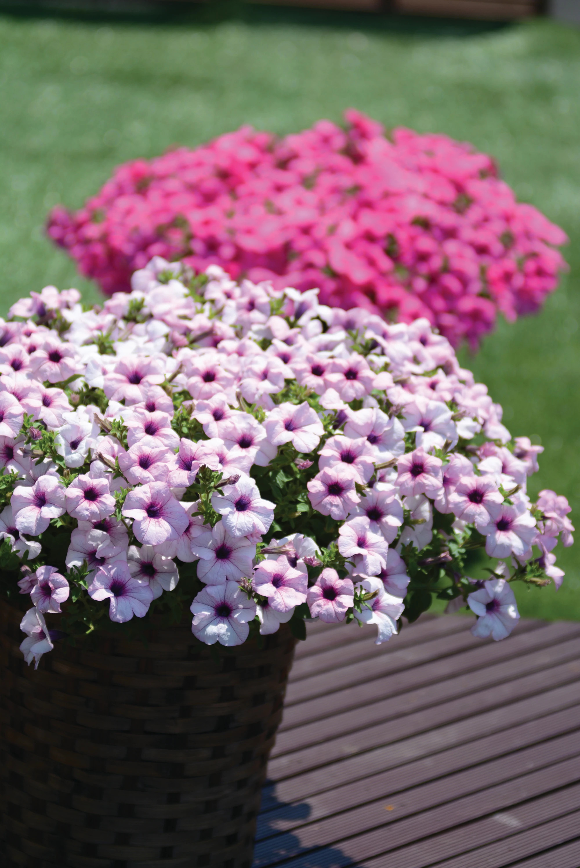 An addition to the Suntory Surfinia Sumo landscape class of petunias is Petunia ‘Sumo Glacial Pink.' Blooms are a light, frosty pink with vibrant pink throats. Vigorous plants create mounds of color that are perfect for landscape beds and very large containers.